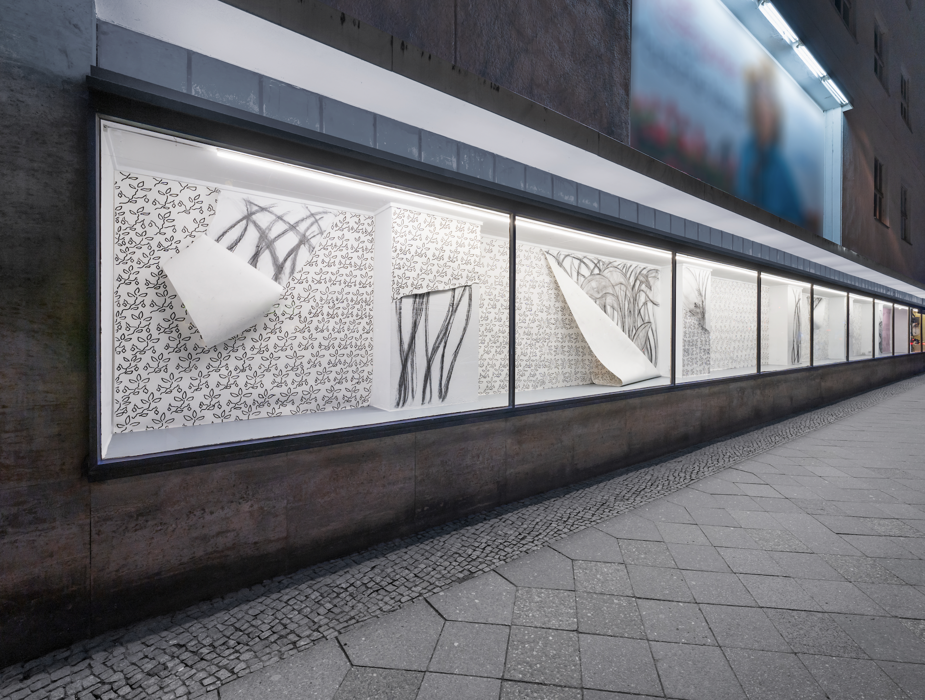 L’œuvre murale Forêt intérieure, produite pour Les Vitrines, aborde la question fondamentale de la place de la nature dans nos villes. Combinaisons de dessins végétaux réalisés sur le vif dans un parc berlinois et de motifs décoratifs allemands travaillés en atelier, l’artiste superpose les lignes autant qu’il les oppose. Traditionnellement présent dans les intérieurs cossus, un papier peint se retrouve déchiré de multiples façons pour révéler une végétation débordante traitée au fusain. Contradiction entre le monde domestique et sauvage, le geste vif de l’artiste rappelle que notre comportement intérieur peut avoir une action politique autant que poétique.